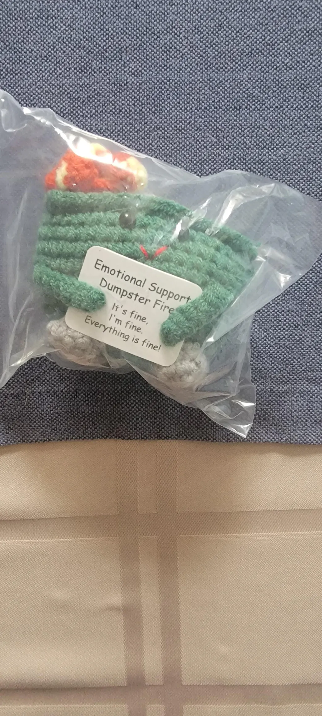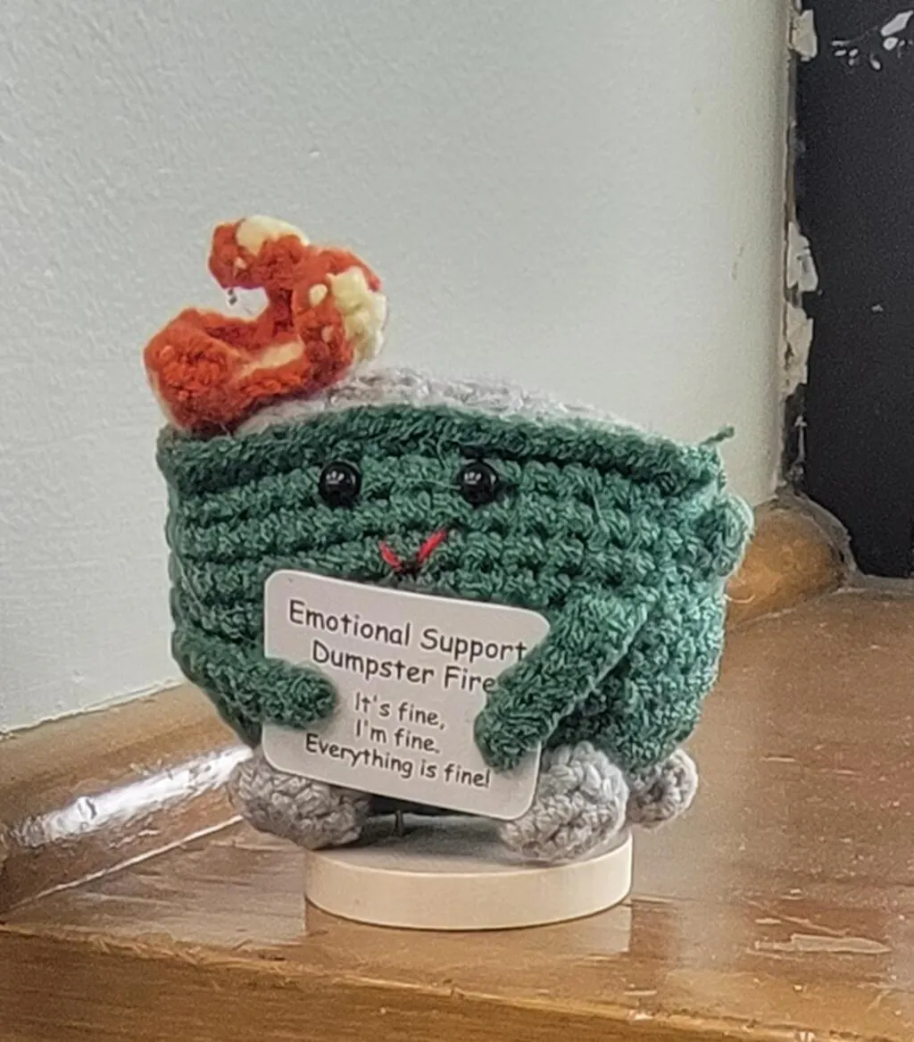 The Handmade Emotional Support Dumpster Fire Burnie is here to lend a comforting embrace whenever you need it. With its soft, hand-knitted design and endearing smile, Burnie is more than just a plush toy; it's a source of comfort, a reminder that you're never alone. Whether it's a tough day or a moment of joy, the Emotional Support Dumpster Fire Burnie is ready to be your loyal companion through it all.